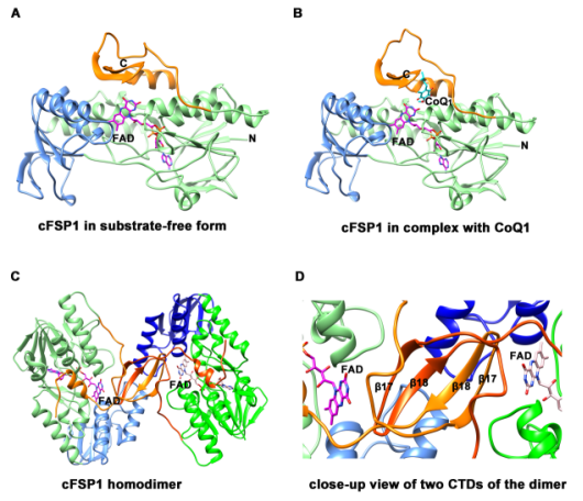 该研究首次揭示了FSP1与辅助因子FAD以及底物COQ10结合的口袋位置,确定了FSP1通过利用其C端形成同源二聚体来发挥催化活性的功能,而且首次发现了FSP1的一个中间代谢产物6-OH-FAD不仅可以作为FSP1的活性辅助因子,还可以作为自由基捕获抗氧化剂直接消除脂质过氧化,该过程独立于COQ10还原途径而发挥作用。