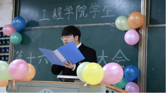 会议首先由第十五届学生会主席屈志垚发表述职报告并宣读第十六届学生会成员的名单;随后,由老师们为第十五届部长颁发证书并合影留念。接着,第十六届学生会主席团五名成员对未来工作展望分别做出就职报告。在主席屈志垚的带领下,第十六届学生会全体成员进行庄严宣誓,表达了严守纪律,勤奋学习,努力工作的决心。最后,郝淑颖老师对学生会工作进行了总结,并对往届学生会干部们的辛勤工作给予了充分肯定,并指出了目前工作上存在的不足,对新一届学生会干部提出要求。