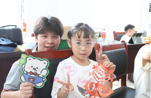 经过首日的破冰互动,欢声笑语,童真交织,小孩子们与志愿者“大孩子们”相处其乐融融。剪纸课程中,志愿者先系统讲解非物质文化遗产剪纸的历史渊源与文化内涵,引出各类剪纸图案的寓意。与首日的基础教学不同,第二日剪纸课程以手工实践为主导。在志愿者的耐心引导下,孩子们手持红纸专注创作,虽手法颇为生疏,作品却充满童真童趣。志愿者将孩子们的剪纸作品集中拍照记录,这些鲜活的创作成为这个夏天最亮眼的文化印记。