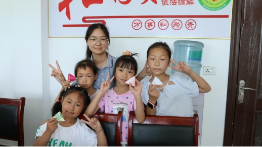 在端午手工课上,志愿者从“端午”二字的起源讲起,延伸至屈原的爱国故事,让孩子们在了解节俗的同时,厚植家国情怀。在“美味粽子”包起来活动中,志愿者手把手教孩子们折“粽叶”、系“粽绳”,耐心纠正手法,一张张“粽叶”在孩子们指尖翻转折叠,不一会儿,形态各异,色彩缤纷的“粽子”便陆续诞生。
