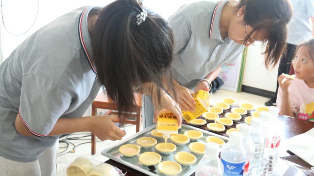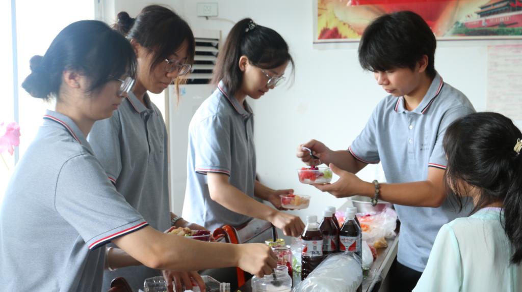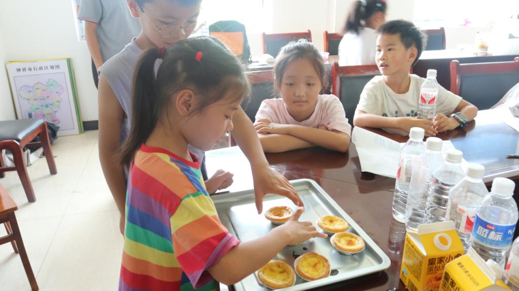 教室里,蛋挞液与酥皮早已备好,志愿者们耐心示范着如何将蛋液注入酥皮,再小心翼翼送入烤箱。孩子们围在一旁,认真地盯着烤箱里逐渐鼓起的蛋挞,鼻尖萦绕着黄油融化的香气,眼里满是期待。另一边的水果冰粉制作区更是热闹,西瓜块、哈密瓜丁、梨片、火龙果粒、阳光玫瑰青提整齐排列,搭配着桂花酱、玫瑰酱、红糖水,还有酸甜的山楂碎和香脆的花生碎,光是看着就让人垂涎。孩子们兴奋地挑选着喜欢的配料,亲手将五颜六色的水果与冰粉拌匀,每一碗都藏着自己的创意。当金黄的蛋挞出炉,清甜的冰粉盛碗,孩子们捧着自己参与制作的美食,你一口我一勺地分享着,空气中弥漫着食物的香甜与离别的不舍。
